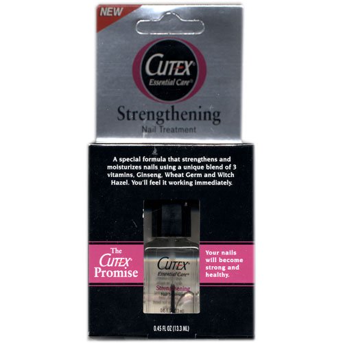Cutex Essential Care Strengthening Nail Treatment contains a unique blend of Vitamin B5, Vitamin E and Vitamin C, along with Ginseng, Wheat Germ and Witch Hazel. The formula is immediately absorbed into the nails and cuticles to moisturize and strengthen. It also provides a unique, revitalizing sensation.Cutex Strengthening Nail Treatment, .45 fl oz Features